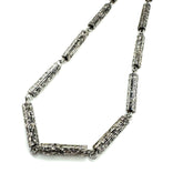Glitterati Necklaces made with super collectible & scarce 1960's confetti glitter beads. The texture in these ribbed style tube beads is unique and features a black core and gold or silver sparkle encased in clear lucite. From the shorter style and adjustable Amelia style, to a Carmen mid-length to the luxurious opera rope style, there is something for everyone this this collection showcasing these amazing pieces. Layer them up or wear them on their own and shine!