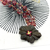 The Forest Muse Aleta Necklace is a romantic, one-of-a-kind statement piece that blends natural beauty with vintage artistry. Strung with faceted maroon transparent beads from Europe, the strand shimmers like garnet glass with every move. At its center rests a hand-carved wooden flower pendant, accented with an 18k gold–dipped butterfly and deep magenta petals — a symbol of transformation and grace.