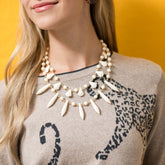 Crafted with authentic vintage Lucite beads, this Amelia necklace pairs smooth rounds with faceted prism-like drops. The result is a necklace that glows with mid-century charm while remaining endlessly wearable. Its creamy neutral palette makes it a timeless statement piece you’ll reach for again and again. Try layering it with our Vanilla Spike Amelia Necklace, as seen in the last photo.