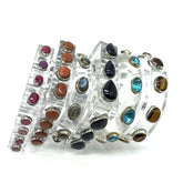 Part of the same bold family as our Mondo bangles, the Clear Lucite Gemstone Bangle Bracelet offers a lighter, glassy take on statement wristwear. Made from solid clear lucite (not resin), each bracelet is hand set with genuine gemstones, allowing the stones to appear as if they’re floating within the bracelet itself.