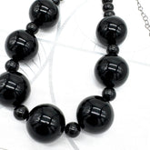 Crafted with authentic vintage Lucite beads, this Marco necklace features focal chunky shiny black beads interspersed with smaller spacers.