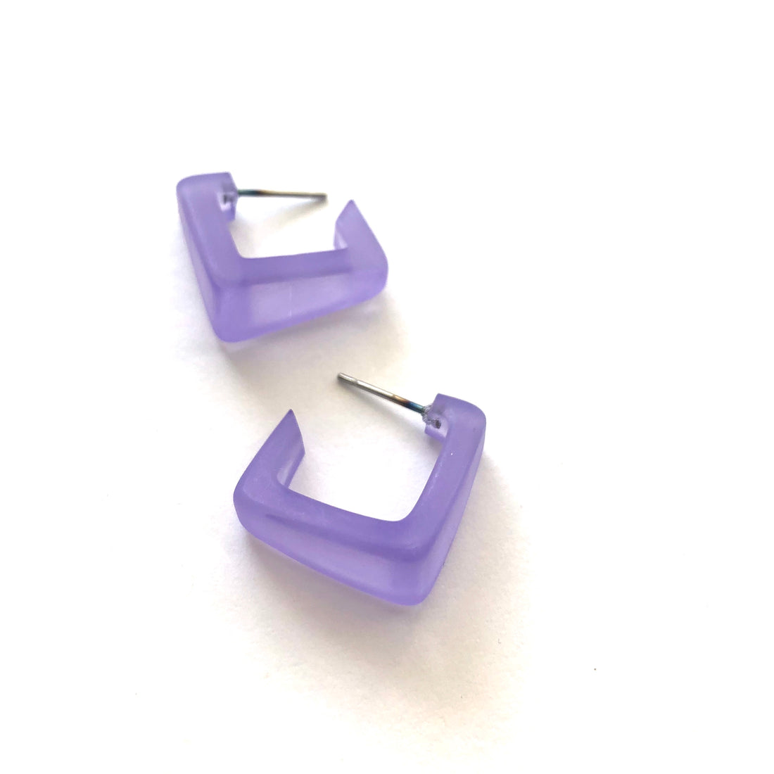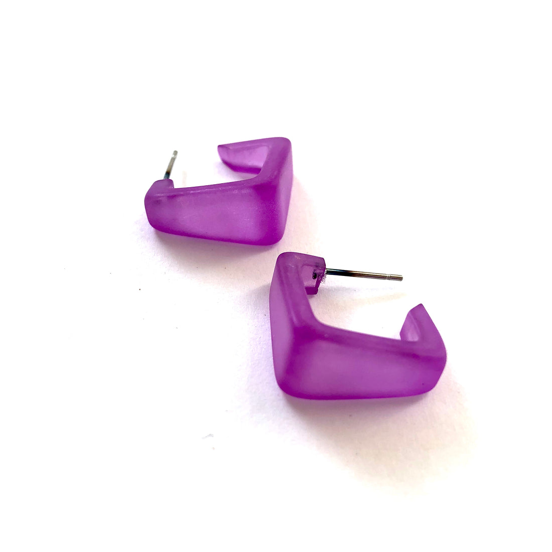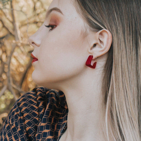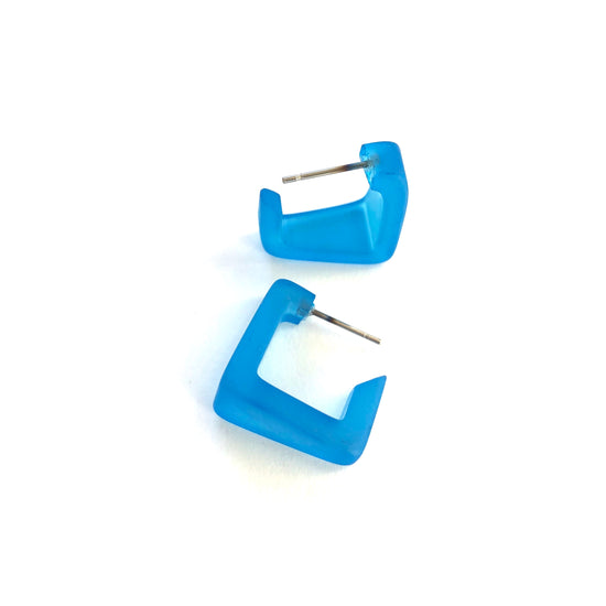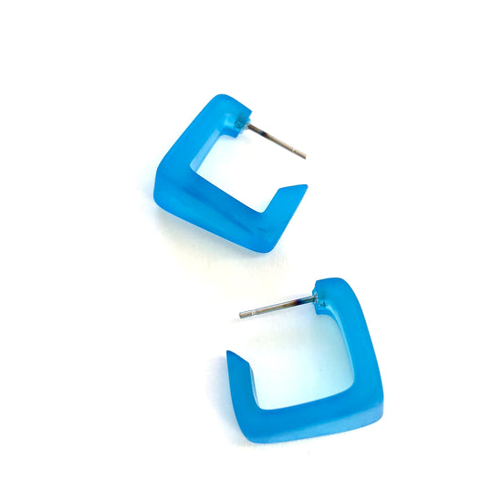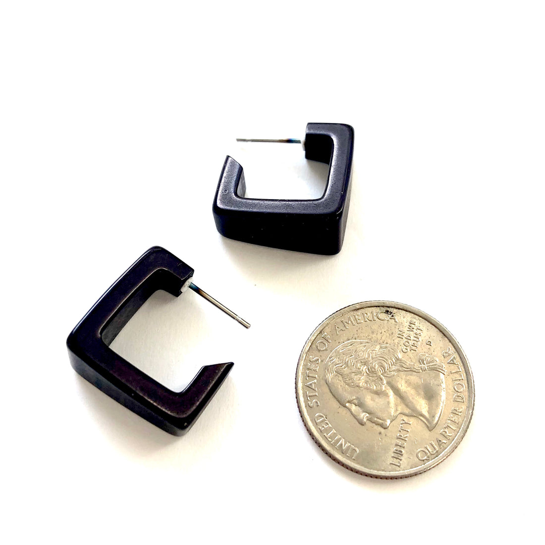 The Bermuda Hoop is a geometric, acrylic, square, angled hoop earring and also a Mini version of the Wide Cubist Hoops. They measure just about 3/4" or 18mmm in diameter or from top to bottom. Each is set by hand with a surgical steel posts making these earrings great for people with sensitive ears. Made with authentically vintage parts & hand-dyed here in our Arizona studio.