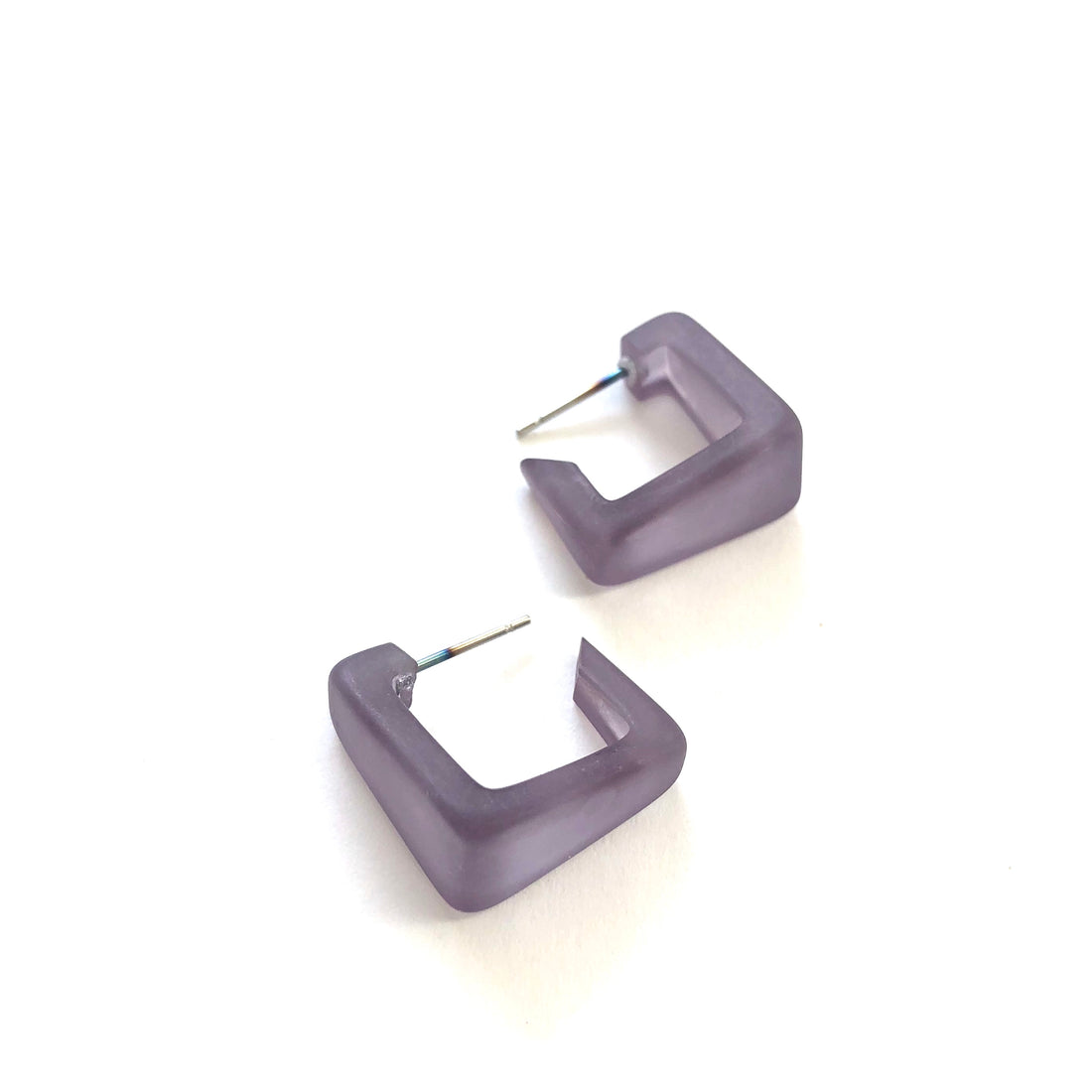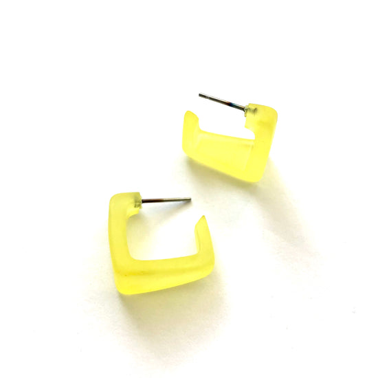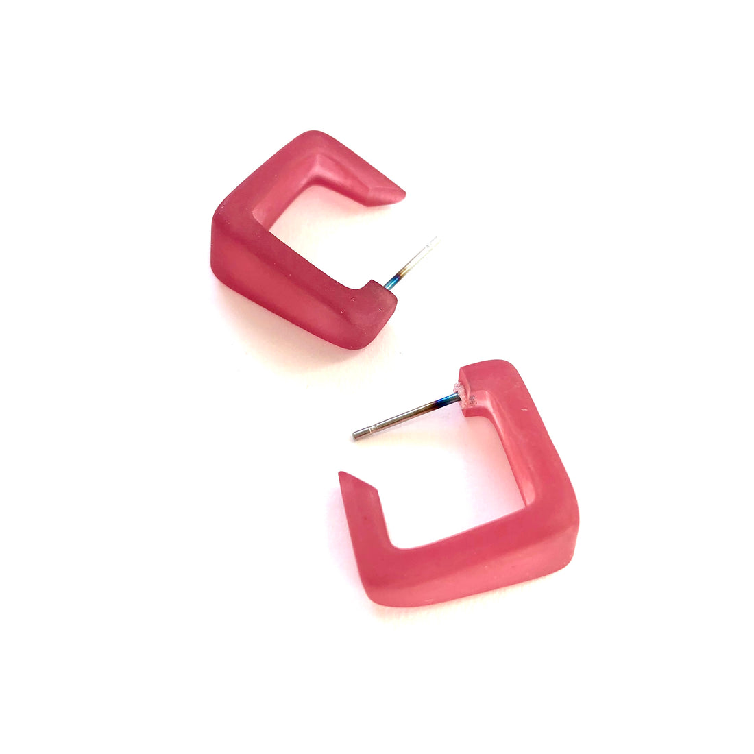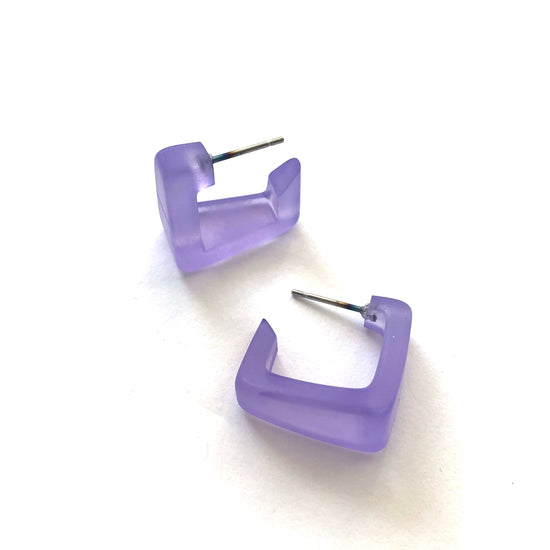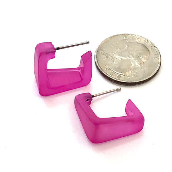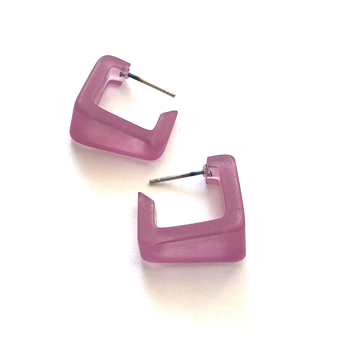 The Bermuda Hoop is a geometric, acrylic, square, angled hoop earring and also a Mini version of the Wide Cubist Hoops. They measure just about 3/4" or 18mmm in diameter or from top to bottom. Each is set by hand with a surgical steel posts making these earrings great for people with sensitive ears. Made with authentically vintage parts & hand-dyed here in our Arizona studio.