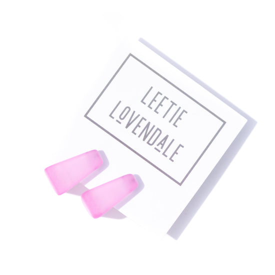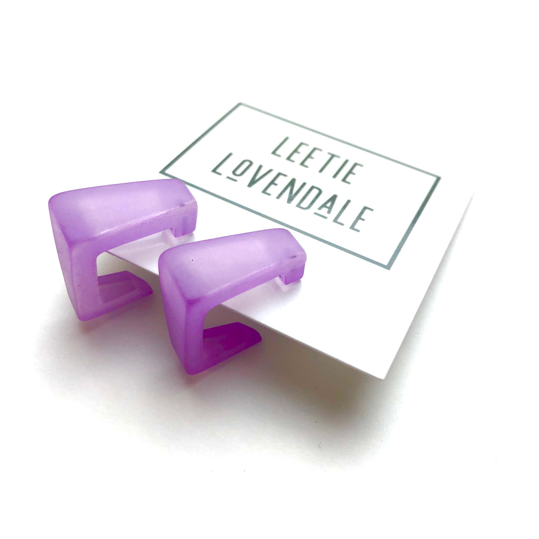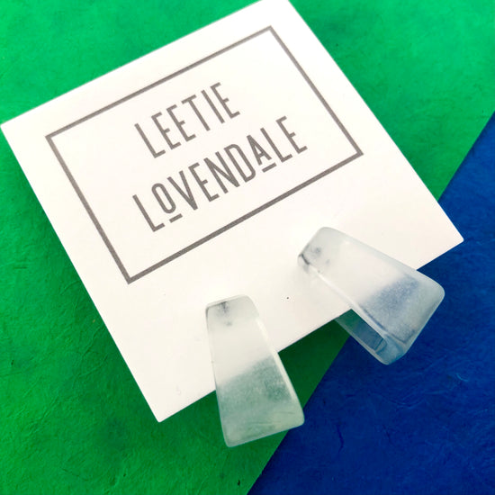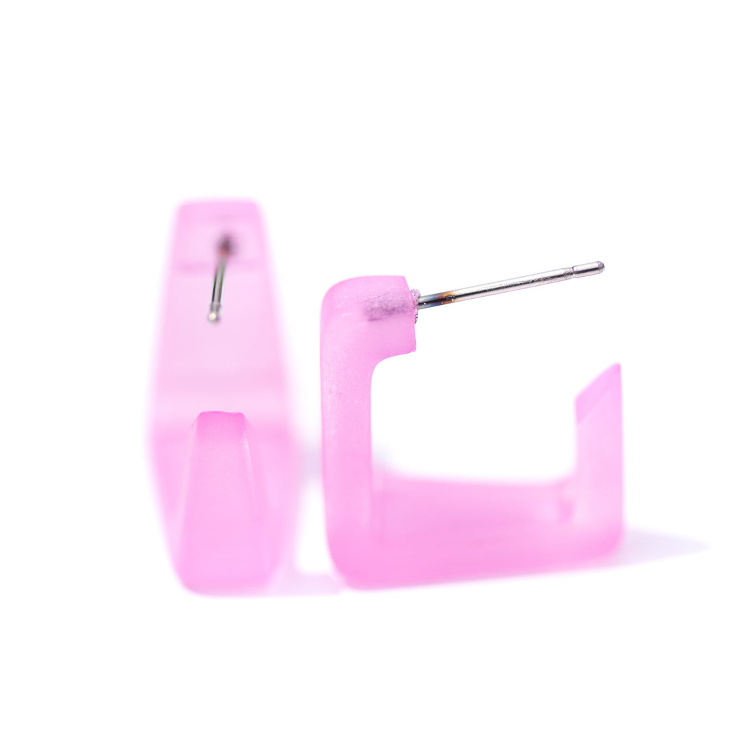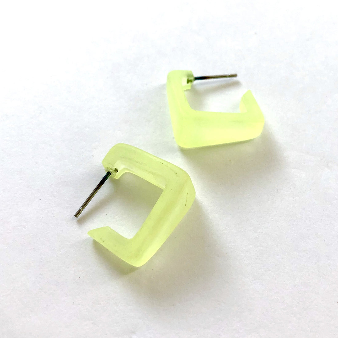 The Bermuda Hoop is a geometric, acrylic, square, angled hoop earring and also a Mini version of the Wide Cubist Hoops. They measure just about 3/4" or 18mmm in diameter or from top to bottom. Each is set by hand with a surgical steel posts making these earrings great for people with sensitive ears. Made with authentically vintage parts & hand-dyed here in our Arizona studio.