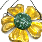 A rare floral treasure with old-world soul. This vintage brass slide bracelet features a sculptural flower centerpiece accented with a 1940s Japanese mosaic resin cabochon, prized for its intricate texture and luminous depth. The warm brass petals frame the richly speckled green center, creating a striking balance of organic form and artisanal detail.