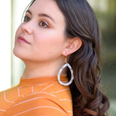 Grey Aurora Borealis & shell finish, hollow teardrop drop earrings with gold plated hypoallergenic lever back ear wires. Chunky statement shape, but super light weight. Each measures 3.2" in length. Ear wires are frosted 24k gold hypoallergenic base metal.
