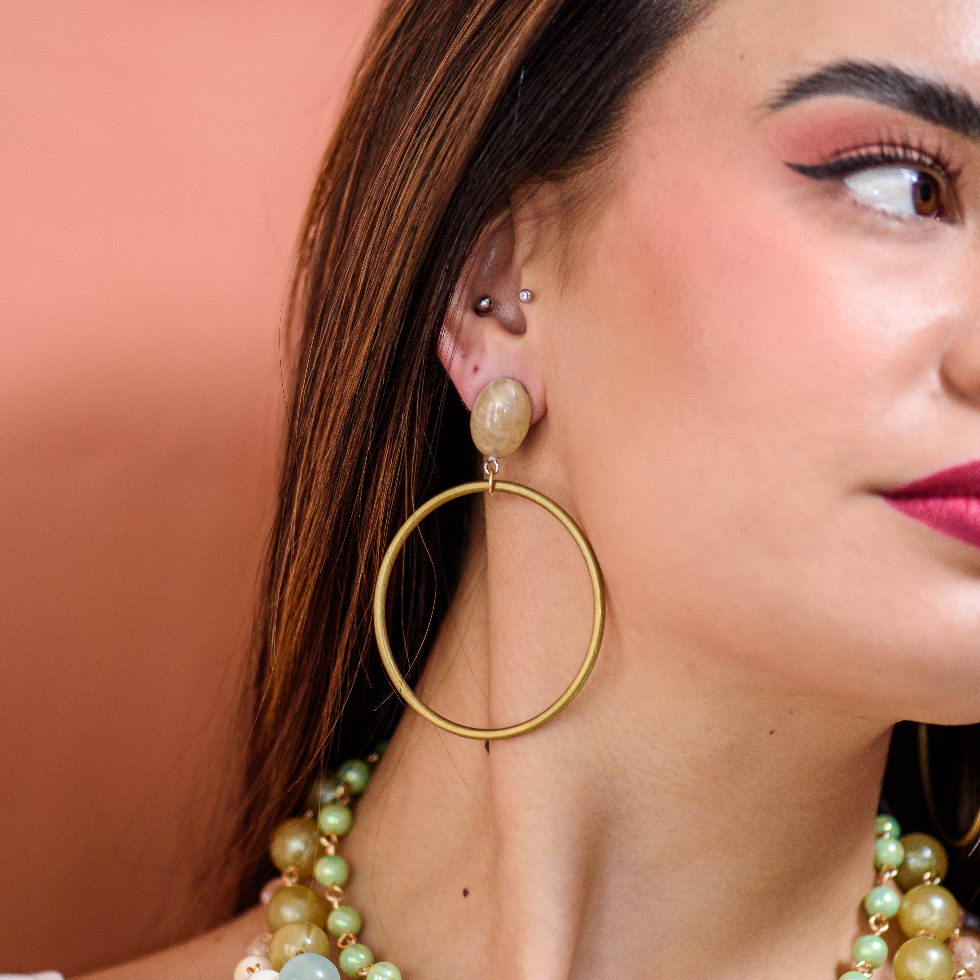 Beige Marbled Brass Loop Earrings