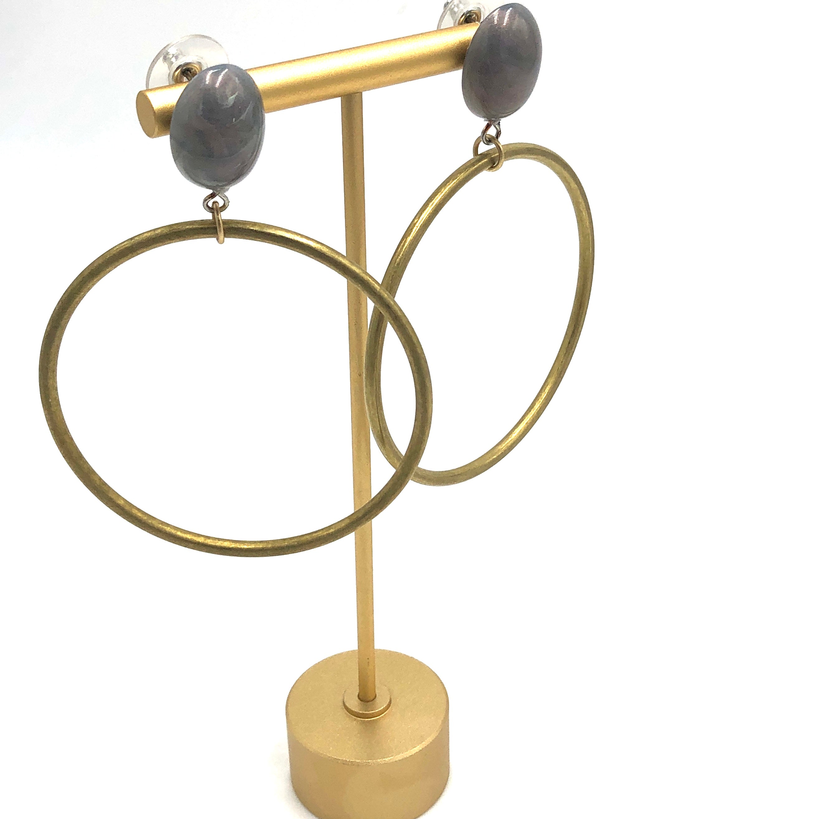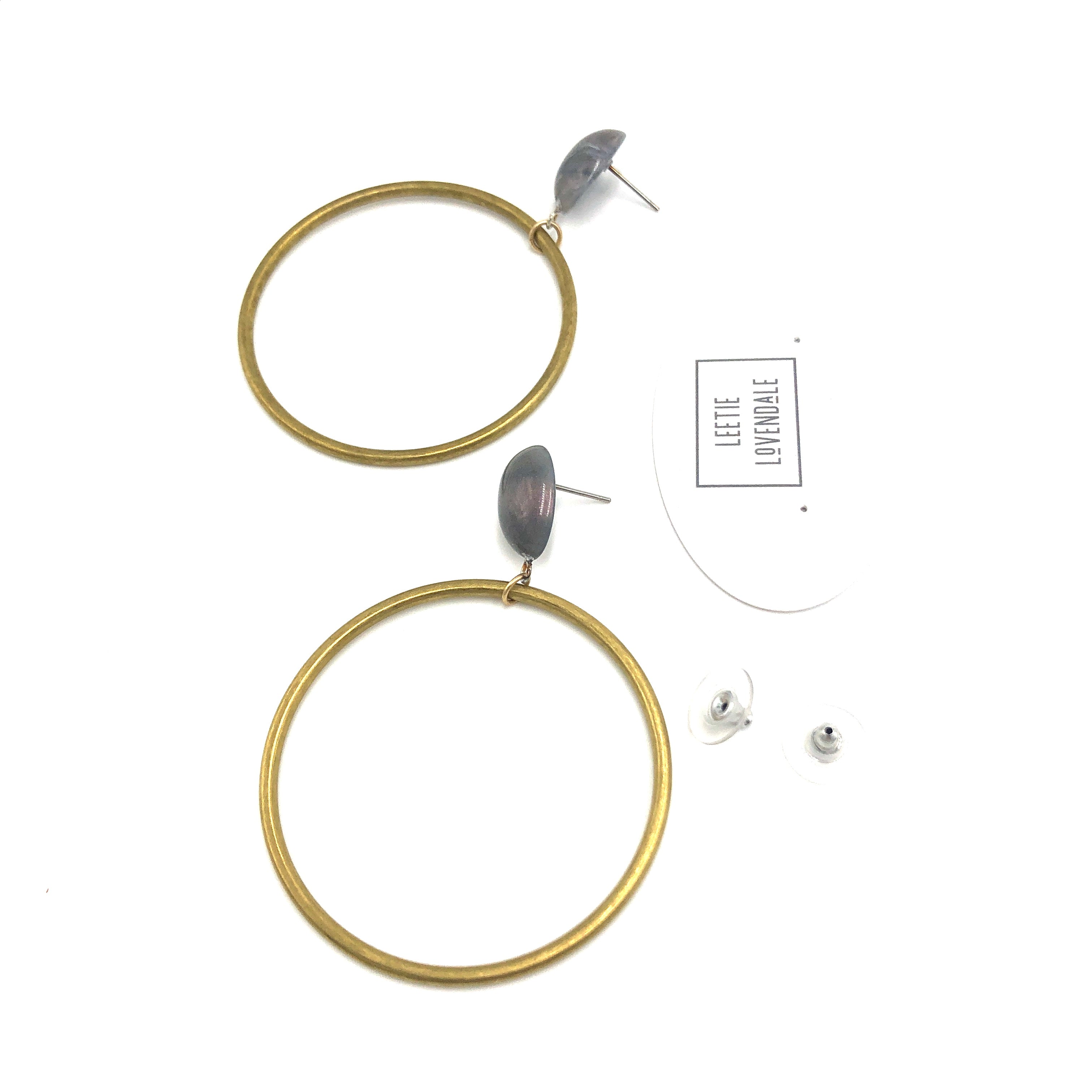 Rare & vintage marbled grey and aurora borealis studs meet vintage brass loops. Striking, sturdy earrings and they are easy to wear. Each measures just about 3" or 60mm from top to bottom, and 2" across at the widest point.