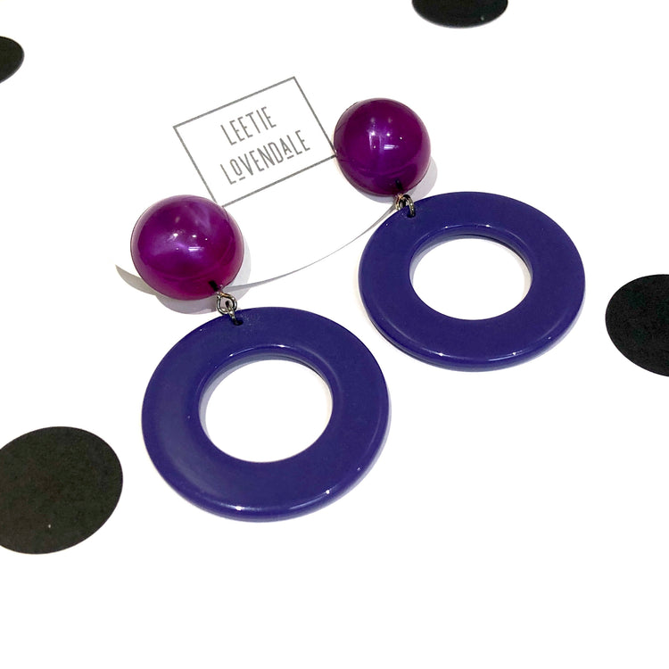 Plum purple Go-Go hoop drops from vintage aura glow lucite studs. Geometric lucite earrings made with vintage parts. These are big & make a statement. Mod meets 80's opulence. Measures just under 2.25" or 60mm from top to bottom, but super lightweight with just enough swing to make a statement.