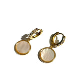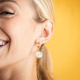 Light up your look with the Lunar Medallion Crystal Huggie Earrings. These radiant drops feature genuine vintage mother-of-pearl medallions framed in warm gold, catching the light with every move. Each charm dangles from sparkling crystal-lined huggie hoops, giving just the right mix of everyday elegance and lunar glow.
