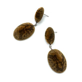 Rich in texture and quietly dramatic, the Double Snakeskin Velvet Earrings feature layered vintage velvet lucite components with a mottled, snakeskin-inspired finish. The soft, flocked surface gives these earrings a tactile depth that feels both organic and elevated—an unexpected twist on classic neutrals.