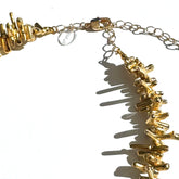 The Golden Reef Necklace is a striking strand that brings ocean-inspired texture to a luxe, modern silhouette. Made from vintage lucite beads plated in 18k gold, each piece was molded to mimic the look of coral sprigs — giving the necklace an organic, sculptural feel.