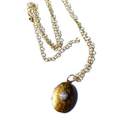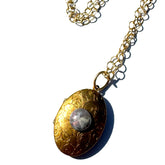 A light grey aurora coated & marbled glowing stone with leafy floral details make this locket feel like a vintage treasure box for your memories. The centerpiece is a swirled etched oval locket made with vintage deadstock from the 1960s–70s. It's set into an ornate oval brass locket from the 1970s, hanging from a modern gold-plated chain.