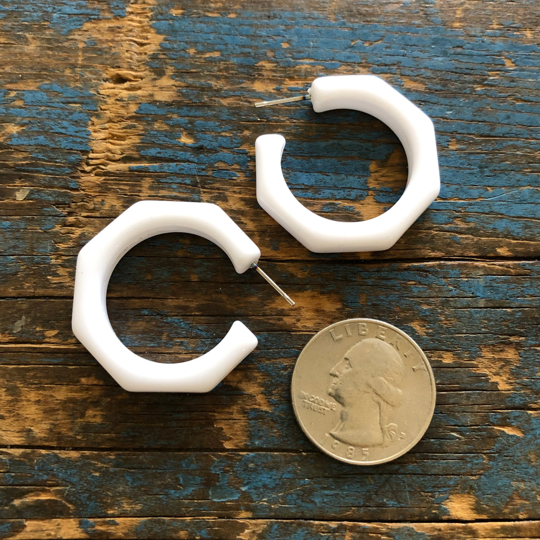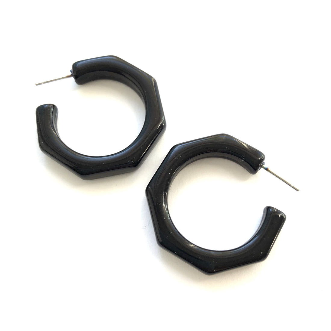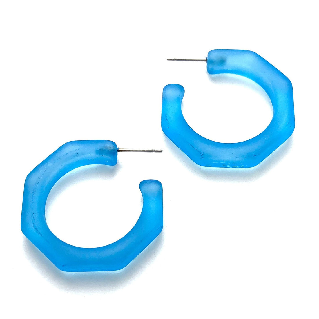 The Kay Hoop Earring is a faceted or Octagon shape, available in loads of colors and the collection is only growing. Made currently with vintage stock, these light-weight lucite pieces are hand set with surgical steel posts.