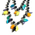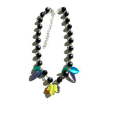 The Enchanted Moonglow Leaves Necklace is a joyful strand of vintage charm and color. Handwired with glossy black 1960’s moonglow beads, this necklace comes alive with dangling leaf charms in a rainbow of moonglow hues — each one made from authentic vintage deadstock lucite.