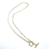 A refined nod to rebellion, the Debutante Darling Necklace is the lighter, more delicate counterpart to our beloved Rebellious Debutante. This modern pearl necklace features genuine freshwater pearls paired with a sleek 18k gold over surgical steel chain, finished with a classic toggle closure for a touch of understated edge.