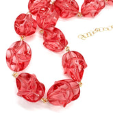 The Rosewater Nugget Amelia Necklace is made with luminous cranberry-pink vintage German lucite beads, softly sculpted into organic nugget shapes that glow with depth and translucency. The color sits right between rose and berry — warm, romantic, and surprisingly versatile.
