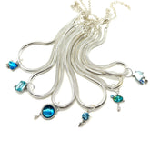 Dare to be unforgettable. The Silver Medusa Necklace is a bold statement piece made from vintage sterling silver-plated mesh snake chains — hollow-core and hypnotic, like the serpents they’re named for. With 15 inches of coiled shimmer and a 6-inch extender for dramatic drop, this necklace is finished with your choice of one of five unique blue-hued pendants — each one-of-a-kind. Cool, oceanic, and just a little dangerous.