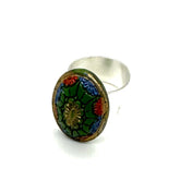 The Old World Green Glass Cocktail Ring feels like a treasure found in a vintage jewelry box from another era. Made from richly detailed Czech glass, this oval cabochon features deep green etched patterns with hand-painted hints of cobalt blue, ruby red, and a soft gold wash. The design evokes the feel of stained glass or a Nordic folk motif — intricate, luminous, and full of history.