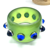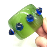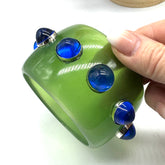 Kelly green translucent bangle bracelet featuring 1960's lucite capri blue gumdrop shaped stones by Best Plastics.