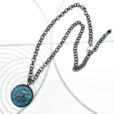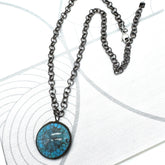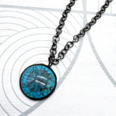 Earthy with a modern edge, the Turquoise Crackle Layering Necklace features a richly crackled vintage Japanese resin pendant designed to resemble natural turquoise. Suspended from a gunmetal rollo chain, the pendant is hand soldered by an artisan on our team, giving each piece subtle variation and a one-of-a-kind feel.