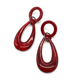 Striking and sculptural, the Ruby Hollow Teardrop Earrings feature deep ruby-red lucite donut studs paired with a coordinating hollow teardrop frame that dangles below. The rich, mottled red lucite catches the light beautifully, creating depth and dimension with every movement.