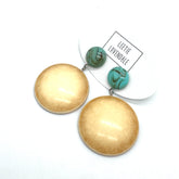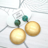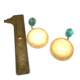 Inspired by sun-washed landscapes and desert artistry, the Santa Fe Disc Earrings pair earthy turquoise-toned vintage lucite with softly glowing golden disc drops. The contrast feels both grounded and luminous — like warm light against painted stone.