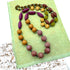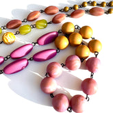 The Canyon Bloom Rosary-chained Rope Necklace is a joyful mix of vintage beads, hand-linked into a long layering strand. Shades of dusty rose, golden ochre, grape, and olive come together in a playful palette that feels both earthy and vibrant. Each bead was made with vintage lucite, rescued from decades past and given new life in this modern design.
