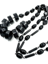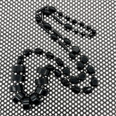 The Midnight Stacked Rosary-Chained Rope Necklace is a showstopper strand made from bold black vintage lucite beads. At the base, oversized disc beads are stacked in a dramatic arc, anchored by a handwired rosary chain of varied shapes — from faceted rounds to sleek ovals and tubular links.