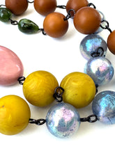 The Paloma Market Carmen Necklace is a joyful celebration of color and craft. Hand-wired with vintage Lucite beads in marbled pink, mustard yellow, iridescent blue-lavender, earthy caramel, and leafy green, it’s a palette that feels like strolling through a sunlit market filled with flowers, art, and life. At 26–28", this mid-length necklace layers beautifully or makes a statement all its own.
