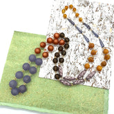 Meet the Periwinkle Copper Rosary-Chained Rope Necklace — a strand that balances soft cools with warm metallics in a perfectly vintage palette. This piece combines frosted periwinkle rounds, rich copper beads, earthy moss, golden amber, and patterned vintage ovals, each hand-linked to create a rope-length strand.