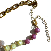 The Half a Heart Y Necklace is where bold vintage style meets modern romance. One side features a chunky 18k gold–plated chain, while the other balances a strand of handwired vintage lucite beads in a playful mix of lilac, lemon, and berry hues. At the center, a puffy heart pendant in 18k gold over brass adds a dramatic focal point.