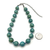 A serene, single-strand statement that brings together soft mineral tones and subtle light play. Smooth, rounded vintage beads in sea-washed green are accented with glints of iridescent glass, creating a rhythm that feels both grounded and quietly luminous.