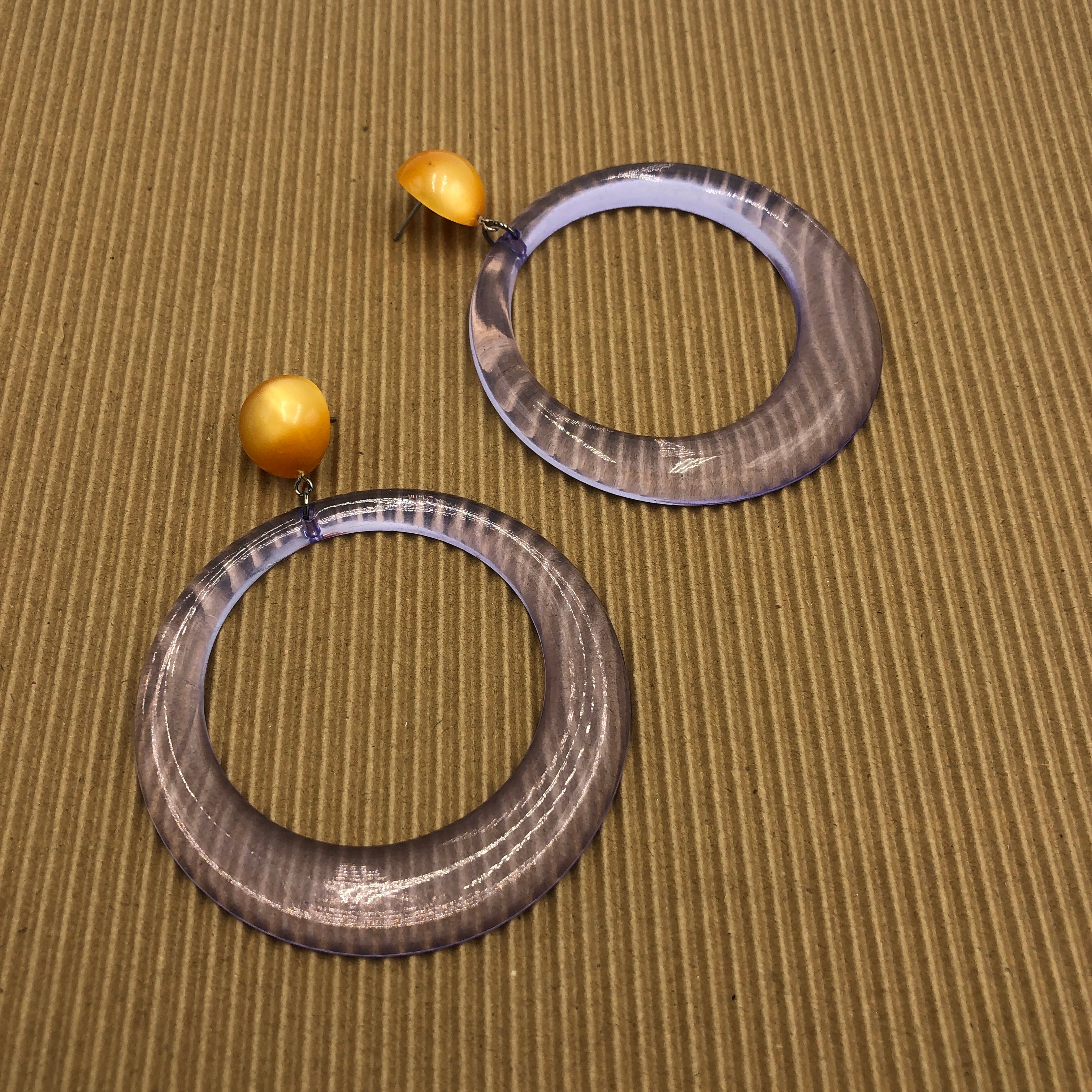 Periwinkle blue-purple drops meet tangerine moonglow disc stud earrings. Big & bold & just the right amount to pop, these artisan earrings feature vintage German lucite drop donuts and 1960's moonglow studs. Iris would be proud = each measures just over 4" in length.