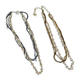 Elevate your jewelry collection with this effortlessly chic layered necklace, blending classic and contemporary design. Featuring a sleek snake chain, a trendy paperclip chain, and delicate rosary-chained vintage pearls, this piece is the perfect mix of timeless elegance and modern style.