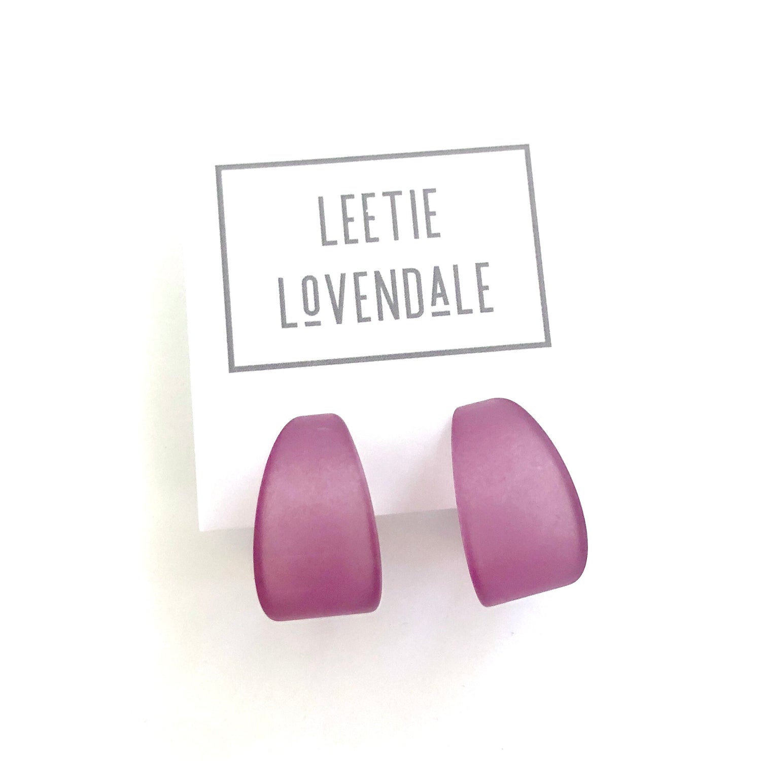 Hoop earrings in the small size of the Marilyn style hoop, a modern style hoop with a frosted finish. The Marilyn Hoop is a tapering or waning shape that starts & ends at a point and widens in the middle. The small version of the Marilyn Hoop measures 1" or 24mm in diameter and 14mm in width. Check out the last pic of the model wearing this size & style in the Clear and Red to get an idea of what they'll look like when you rock them!