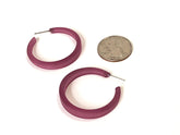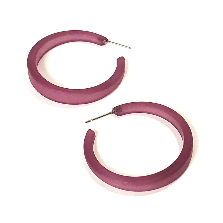 Frosted hoop earrings in a finely shaped & tapered hoop shape that measures approximately 1.5" or 37mm in diameter and 7mm at the widest. This style is known as the Phoenix Hoop. This finish is so super popular and this is one of the most popular colors in the line. The finish is lucite but it resembles sea glass.