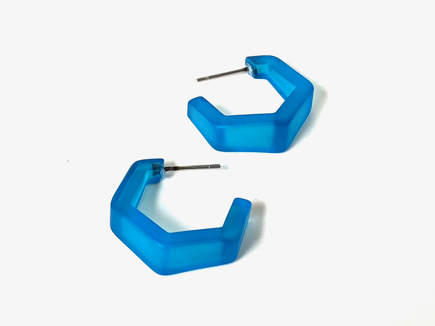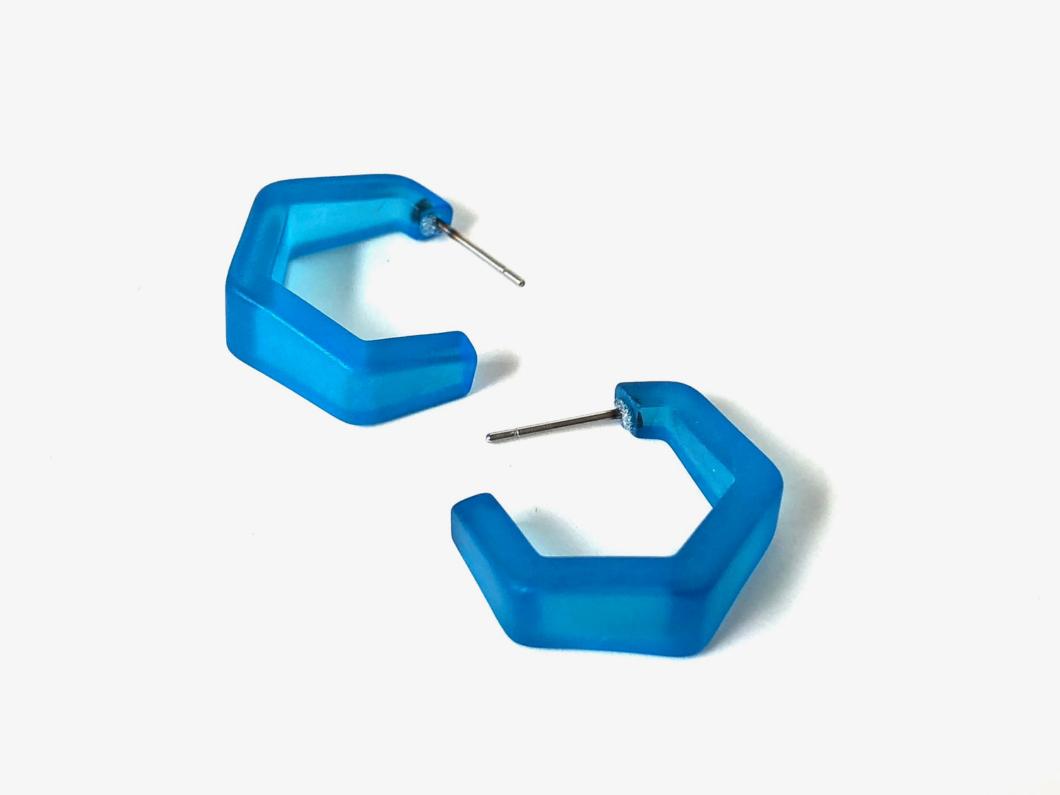 Hoop earrings in a frosted finish. This style is known as the mini tapered Hex Hoops and it's the perfect little darling angular hoop. Each measures just under 1" in diameter & 6mm in width. The picture of the model shows a similar and non-tapered style.