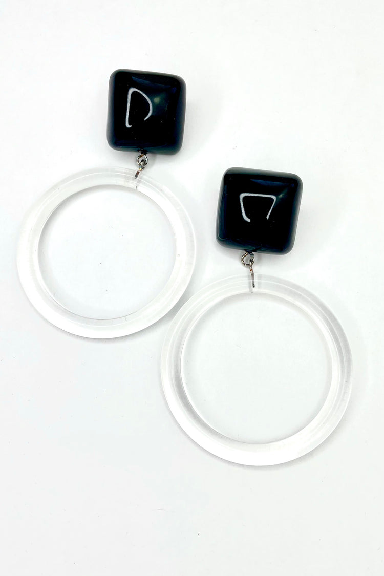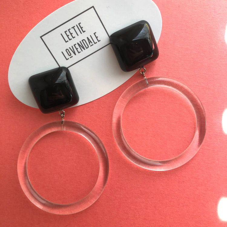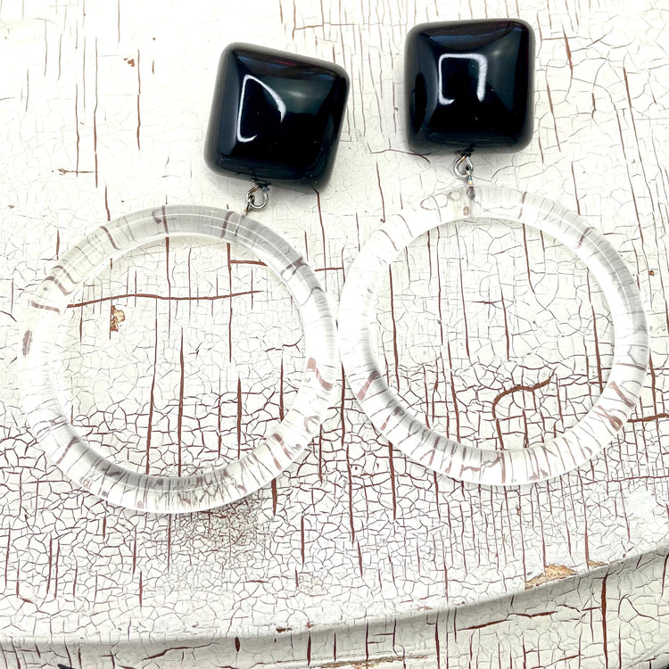 Clear vintage lucite Go Go hoop drop from vintage acrylic studs in chunky black squares. Geometric lucite meets deco style, in these earrings made with vintage parts. These are big & make a statement. Measures just under 3" or 76mm from top to bottom, but super light weight with just enough swing to make a statement.