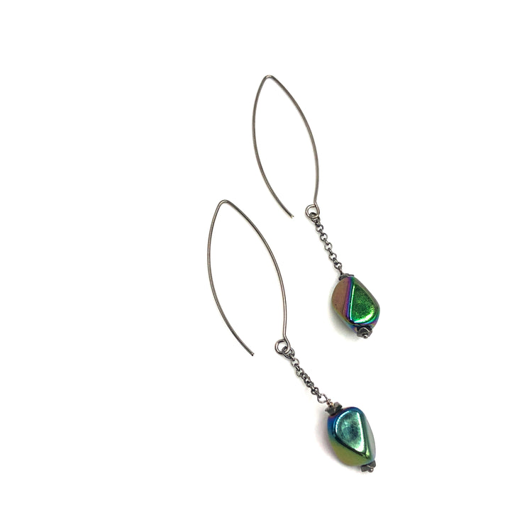 Black & metallic iris coated vintage beads cascade from some elegant chain. Each vintage bead is paired with gun metal chain & hypoallergenic earwires. Each measures 2.5" in length.