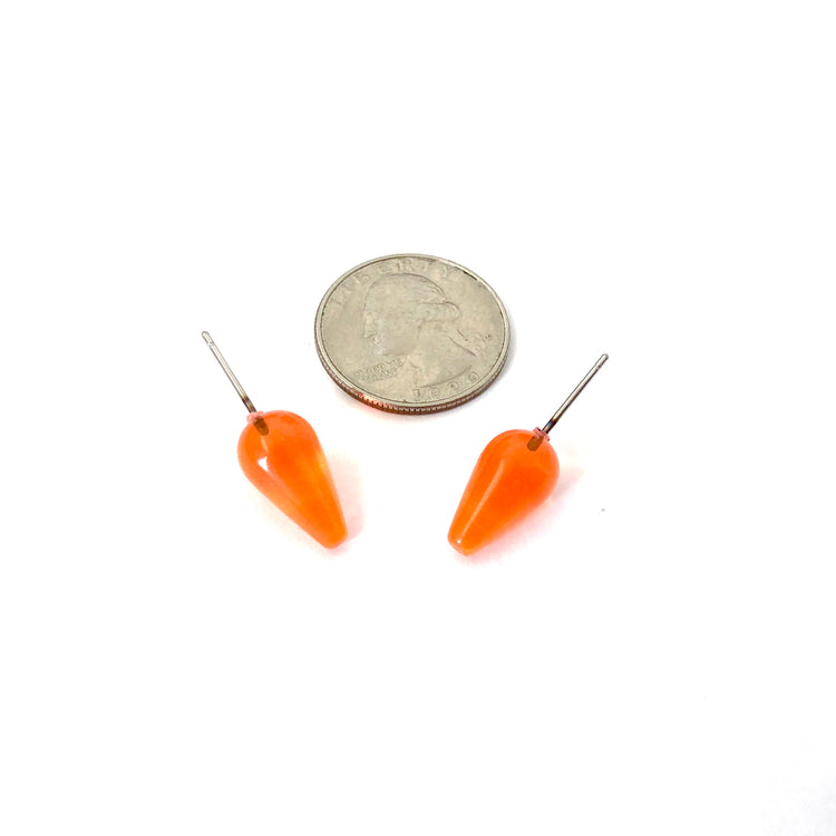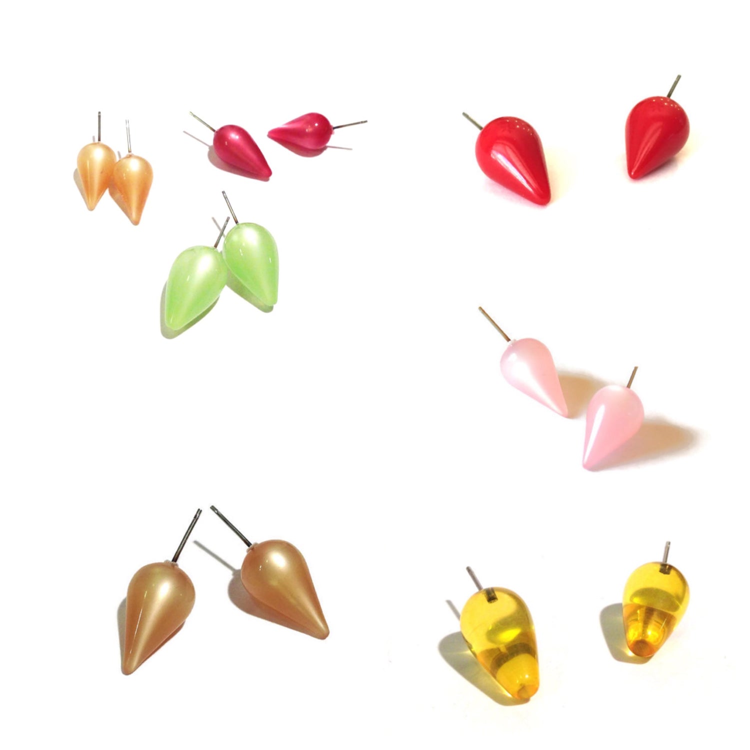 Earrings are made with vintage lucite parts that were made in Rhode Island in the 1960's - early 80's by Best Plastics. We hand-set them with surgical steel earring posts and they have sturdy surgical steel/acrylic backings on them as well. Light-weight & fun to wear.
