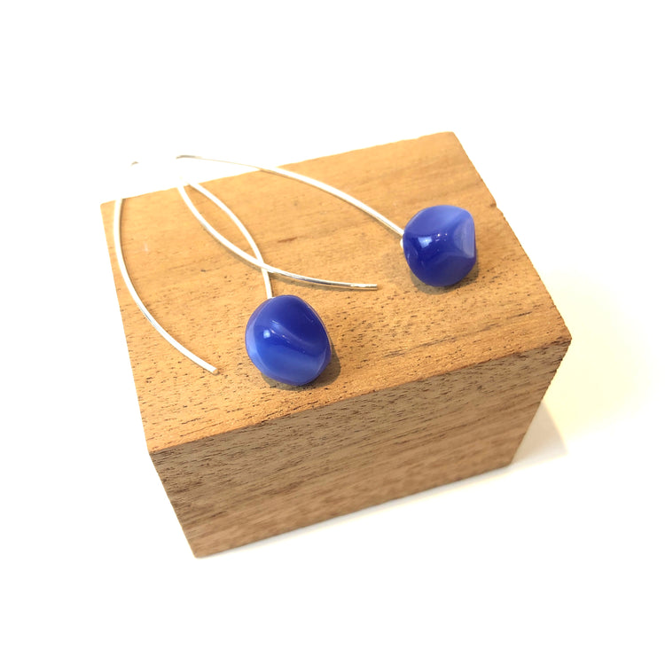 Blue moonglow button drop earrings featuring long and lean raindrop earwires. Available in frosted 24k gold or sterling plated hypoallergenic metal. Each measures about 2.25" in length.