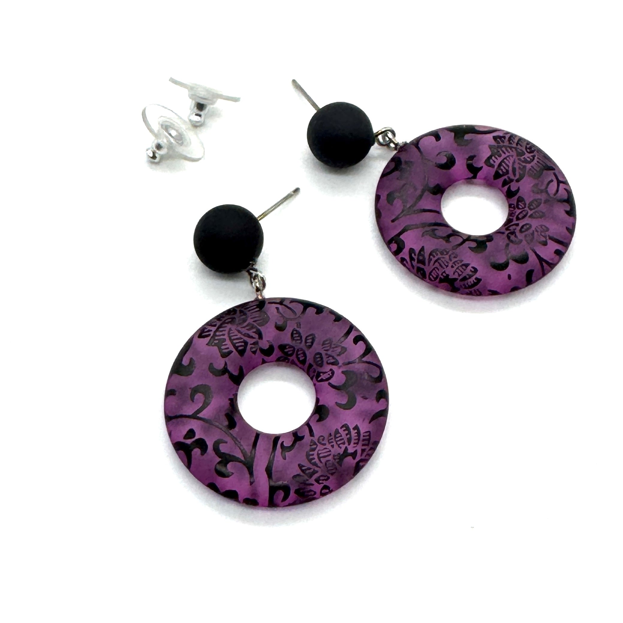 Bold, moody, and beautifully intricate—our Botanica Noir Drops are a statement earring with vintage soul. Each frosted lucite hoop is hand-dyed and etched with delicate floral detailing, giving you that lace-meets-botanical look. Suspended from matte black studs, they’re lightweight but full of impact.