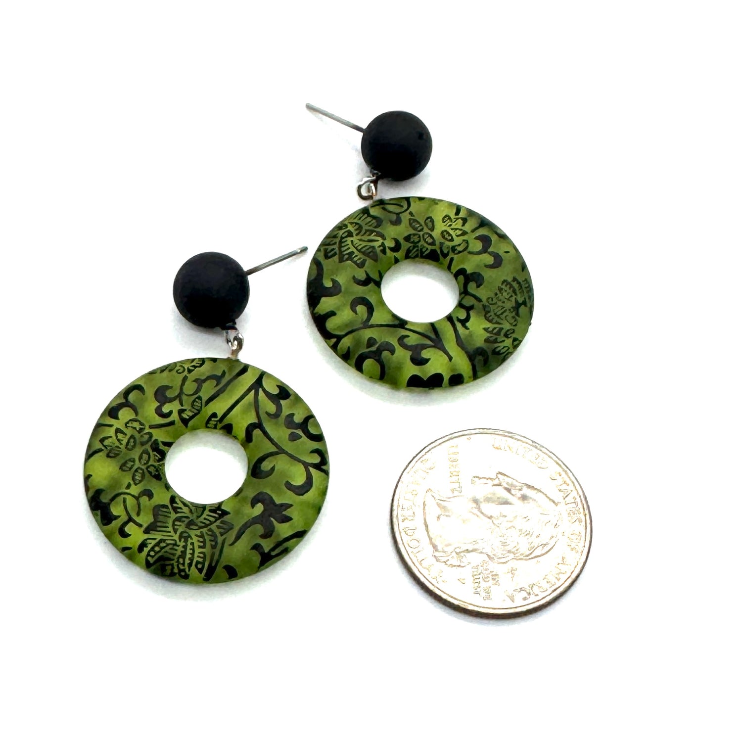 • Donut-style lucite drops hand-dyed and carved with floral motifs