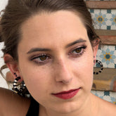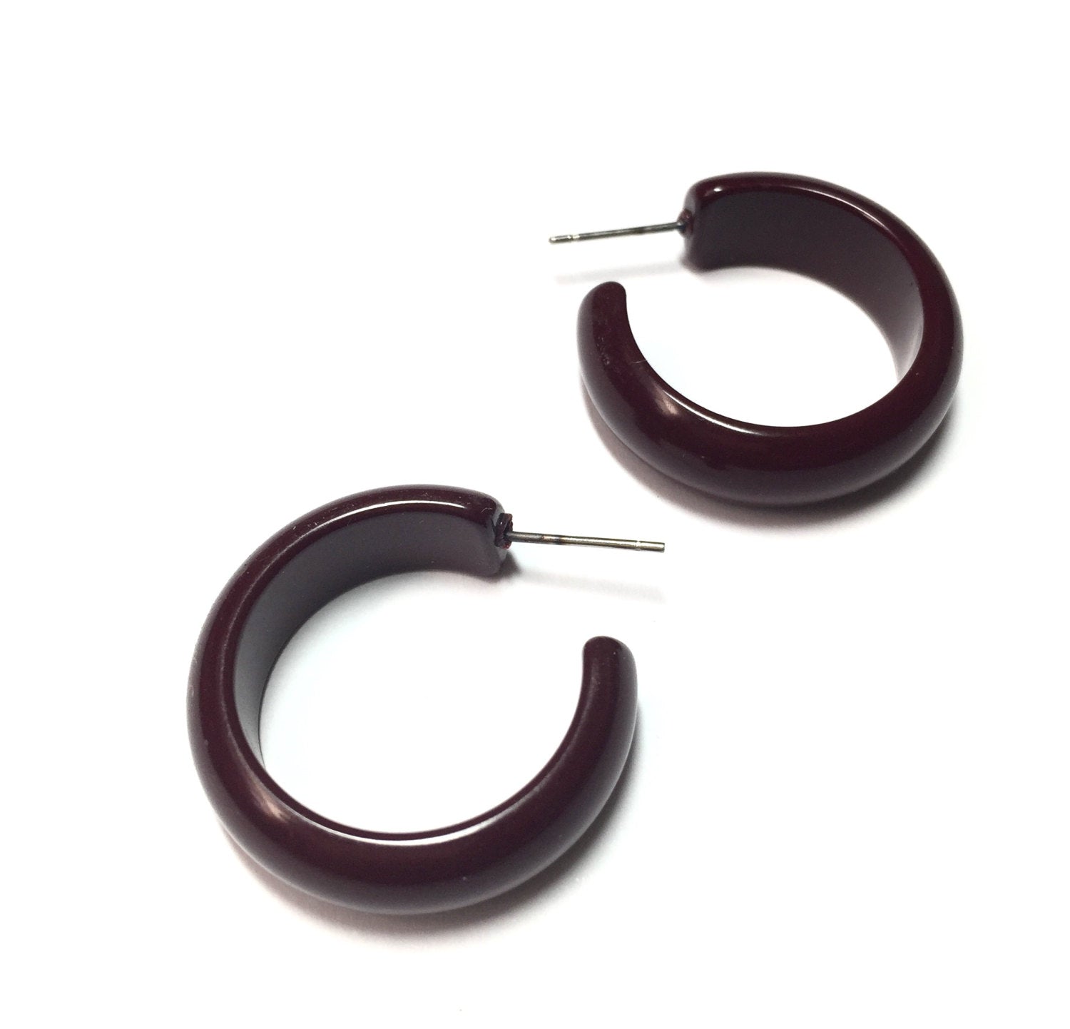 This design is called the Simple Hoop, and it comes in other color options as well. Each one is about 1.2" or 30mm in circumference and 9mm wide. Take a peek at how they look on the model to get an idea of the size and scale. These earrings are fashioned with vintage lucite components from Best Plastics, crafted in Rhode Island between the 1960s and early 80s. We carefully attach them to surgical steel earring posts with durable surgical steel and acrylic backings. They're lightweight and playful to wear.