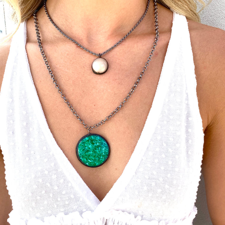 Our new Leetie Layering necklace line! We are going to be offering a collection of vintage lucite and resin pendants, hand soldered and paired with blackened gun metal. A collaboration with Three Beads & a Sting, each style is super limited & available in single lengths with an extender for adjustability. These are made to be worn in multiples and alongside other pieces of varying lengths.