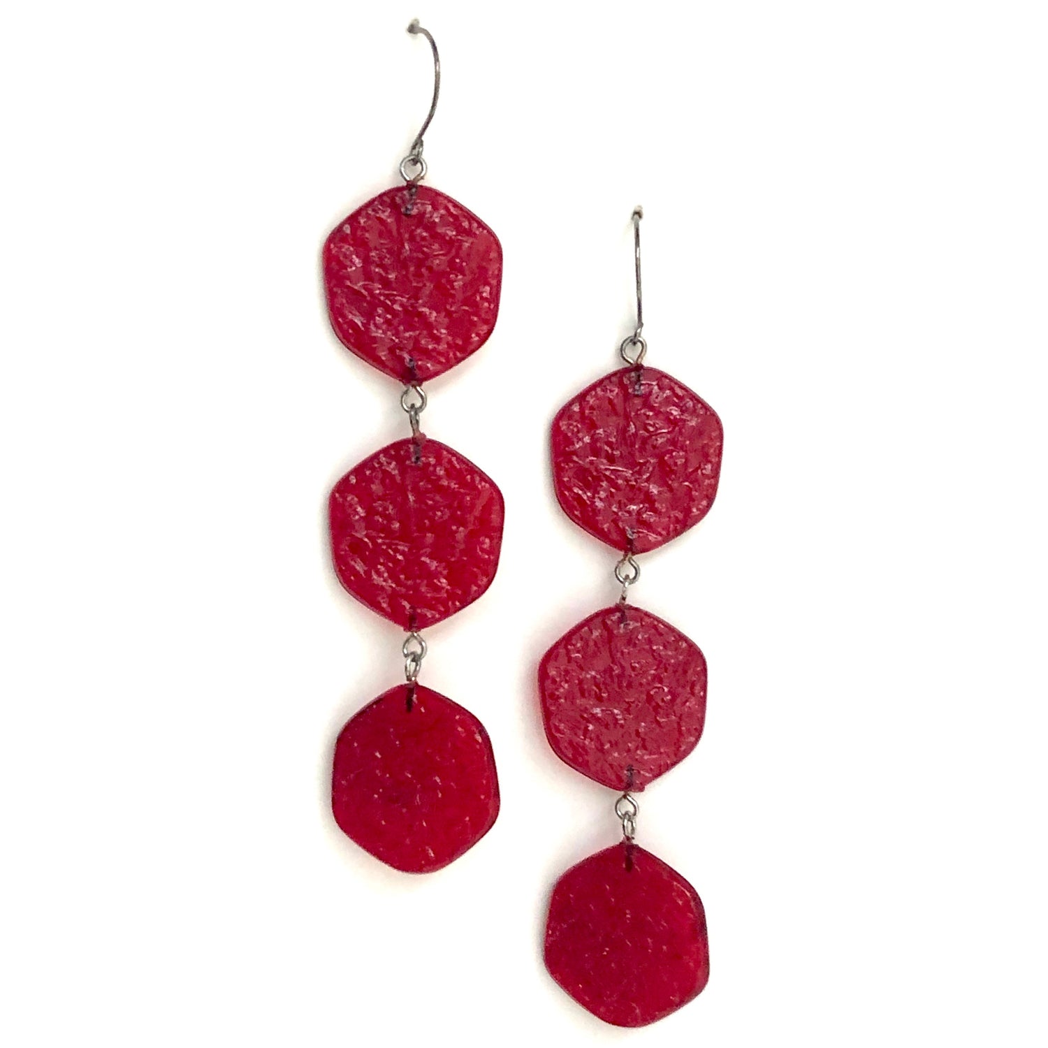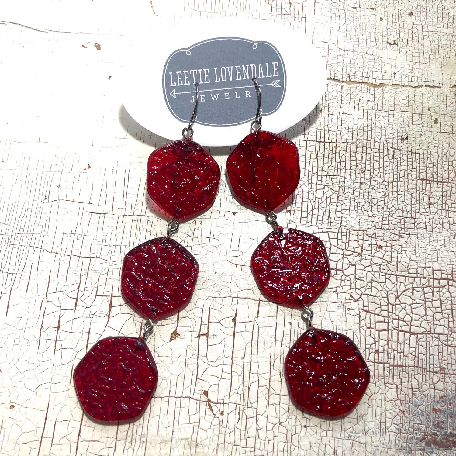 'Stained Glass' drop earrings in a great size & a transparent finish. These fun statement earrings are triple-linked and bold & the texture mimics stained glass windows in cathedrals even though it is made of light-weight vintage lucite.