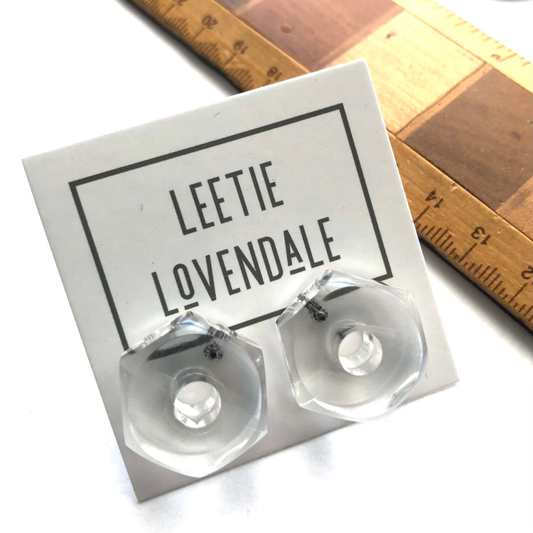 Clear transparent donut studs in crystal lucite and a chunky nut & bolt motif. Donut Stud measures about .75" or 21mm in diameter. Super light weight & hand set with surgical steel posts, you'll want to collect these in all colors.