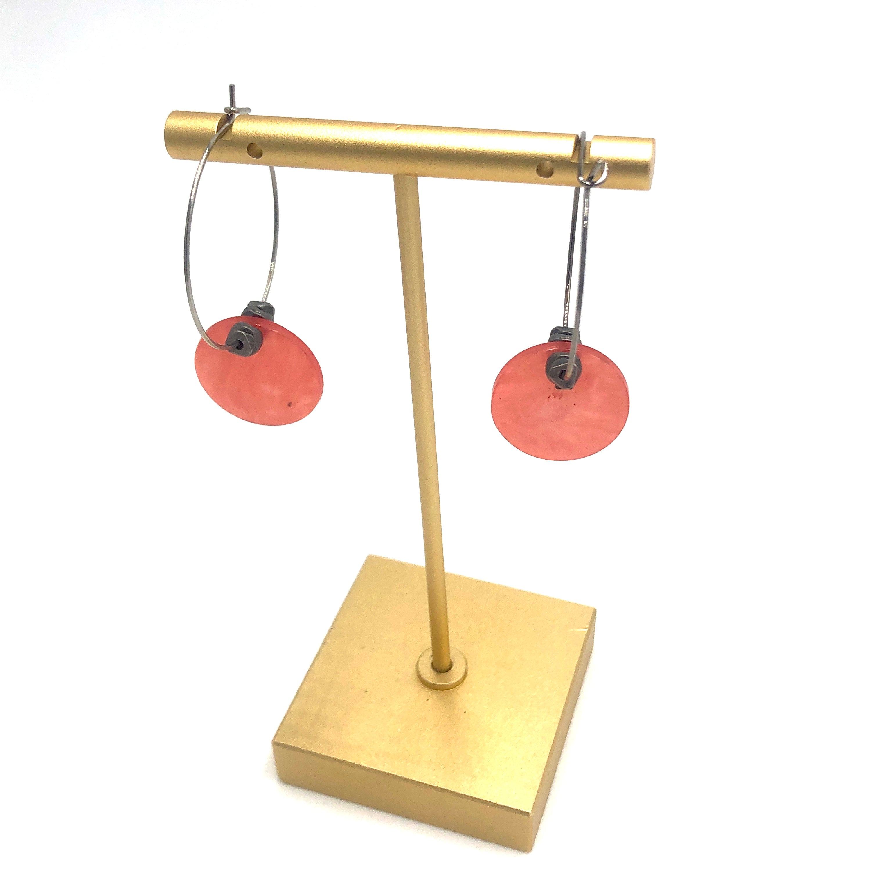 Marbled shell-like discs cascade from frosted 24k gold plated hoops.  This style is lightweight & fun to wear, featuring vintage lucite & hypoallergenic ear wires. This modern & sleek style highlights neutral beige charms with a sturdy yet flexible wires. Statement earrings that are light-weight but make a splash.
