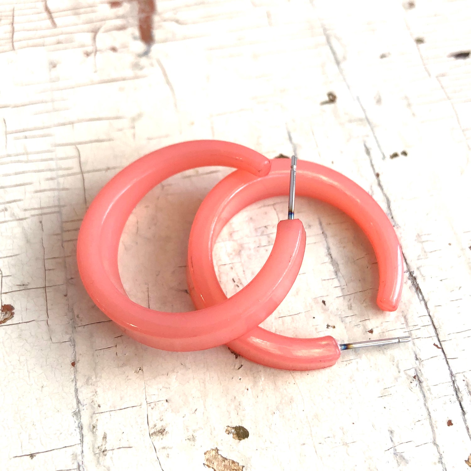 These hoop earrings in an almost milk-glass like, opalescent finish. The 'Lola' is a hoop earring that starts at nothing at the lobe and then gets a little wider, and then tapers again. Each small tapered hoop measures about 1.25" (28mm) in diameter & 7mm in width at the widest.